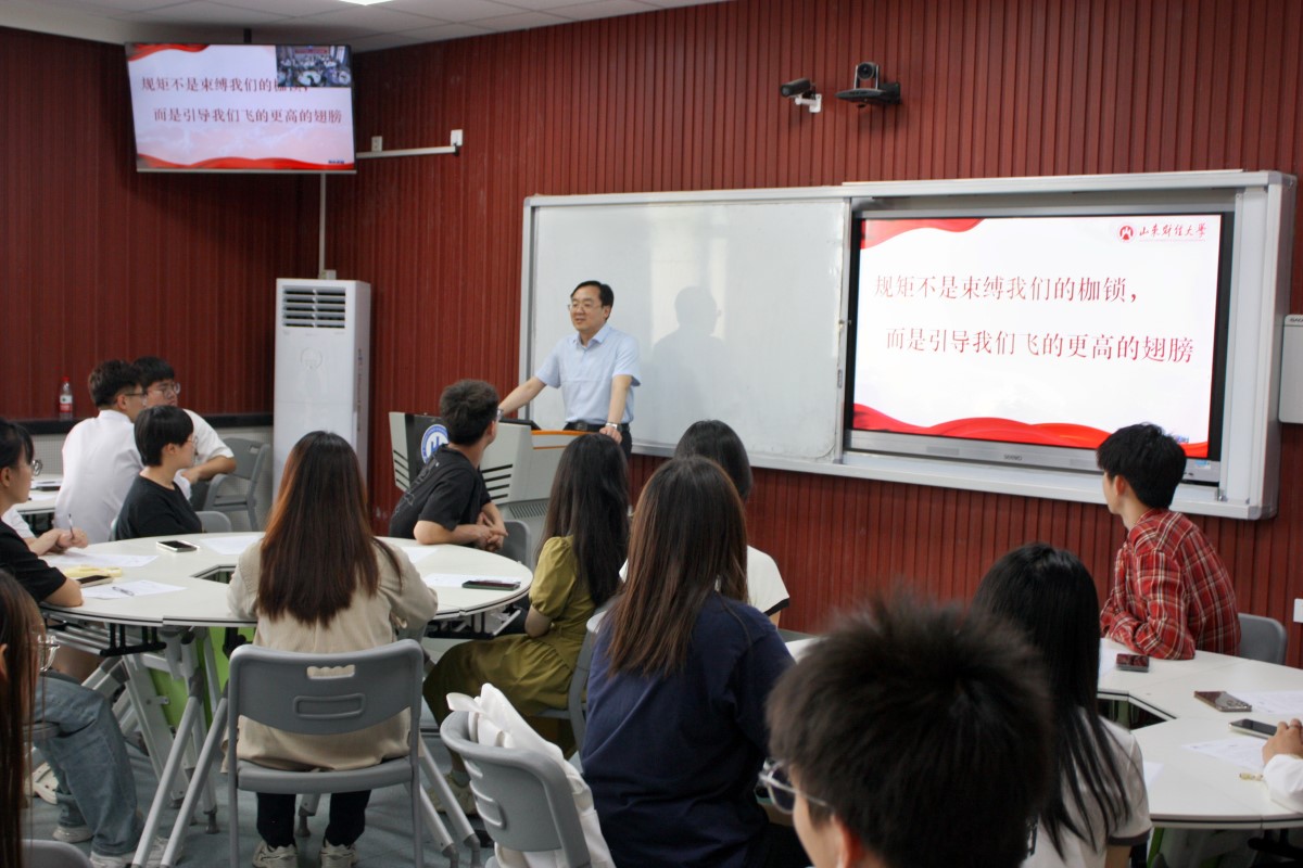 6月7日下午,为进一步强化校规校纪教育,深入推进学风建设,保险学院2023级保险学(保险投资方向)1班一场别开生面的“加强纪律意识 共建和谐校园——学条例 明事理 守校纪 遵校纪”主题班会,在圣井校区七号教学楼411智慧教室举行。副校长王敬政受邀参加班会,学生工作部、保险学院相关负责人共同参加活动。