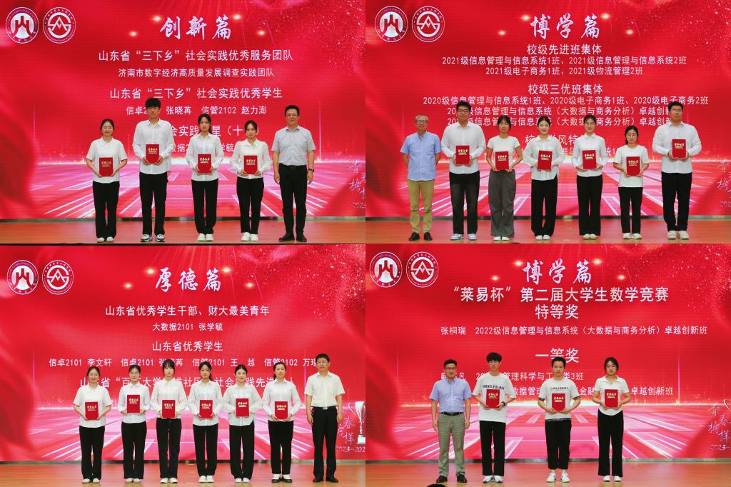 典礼上,山东省先进班集体2021级信管1班团支书寇子萱、国家奖学金获得者杜黎、圣泉创新之星获得者李文轩、圣泉自强之星获得者丁甲旺分别进行风采展示,他们从班级建设、学习方法、创新创业竞赛、个人成长成才等方面分享了自己的经历和感悟。