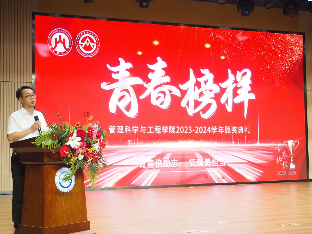 学院党委书记徐世星宣读《2023-2024学年管理科学与工程学院青春榜样表彰决定》。随后,典礼开始进入颁奖环节,到场嘉宾为在德、智、体、美、劳各方面表现突出的集体和个人颁奖。