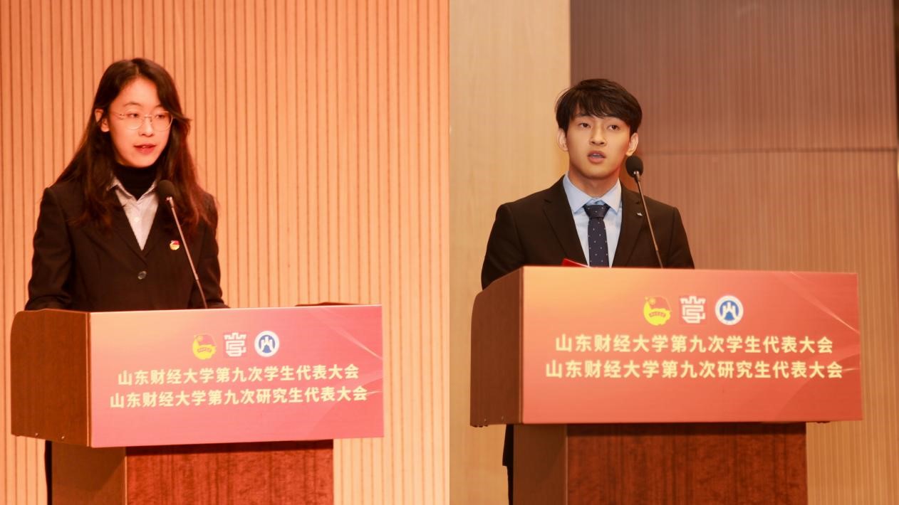 山东财经大学第八届学生会执行主席、会计学院2021级本科生王新宇作山东财经大学第八届学生会工作报告,第八届研究生会执行主席、金融学院2022级研究生王宏磊作山东财经大学第八届研究生会工作报告,对学生会、研究生会工作进行了全面总结汇报,并对未来提出规划。
