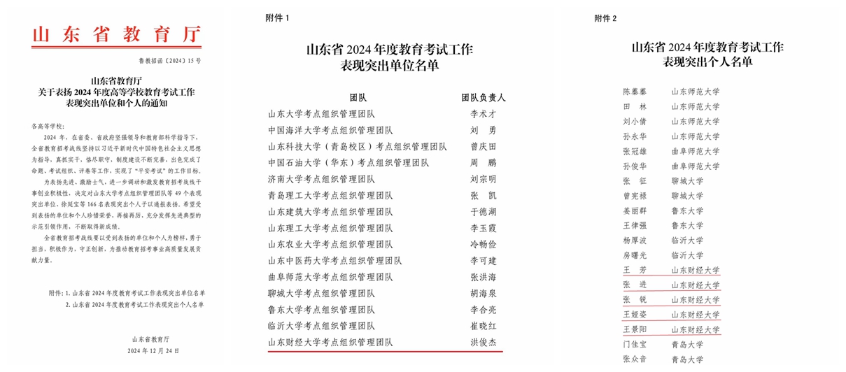 近日,山东省教育厅发文对在2024年度高等学校教育考试工作中表现突出的单位和个人予以通报表扬。山东财经大学考点组织管理团队获得“山东省2024年度教育考试工作表现突出单位”荣誉称号,团队成员王芳、张进、张锐、王娅姿、王景阳获得“山东省2024年度教育考试工作表现突出个人”荣誉称号。这是我校继获得山东省教育考试优秀考点、优秀评卷点、优秀研究生招生考试自命题单位等荣誉称号后获得的又一殊荣。