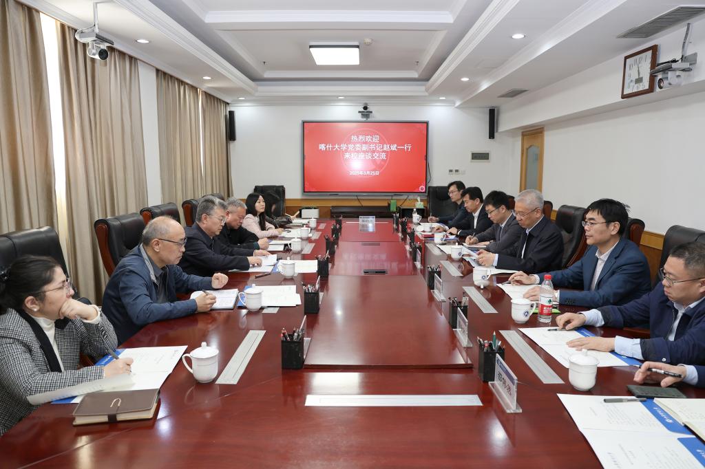 张新对赵斌一行来访表示热烈欢迎,对喀什大学给予我校援疆干部、老师的关心支持表示感谢。他简要介绍了学校近年来在学科建设、人才培养、科学研究、社会服务、国际交流合作等方面取得的进展。他表示,喀什大学底蕴深厚,作为扎根祖国西部边陲的现代化综合性大学,坚持立足边疆、服务新疆,以源源不断的创新活力和奋勇向前的发展劲头,在人才培养、服务地方、文化传承等领域取得了诸多亮眼的成绩。他希望双方能够充分发挥各自的学科专业优势,促成两校资源共享、优势整合,共同推动两校宽领域、深层次的高水平合作。