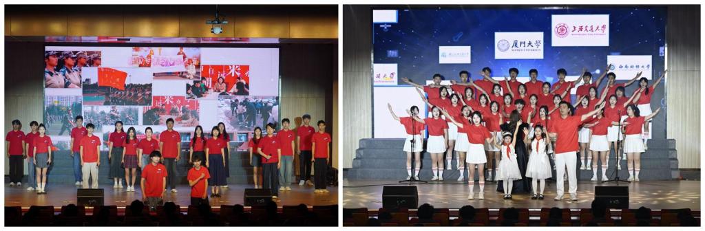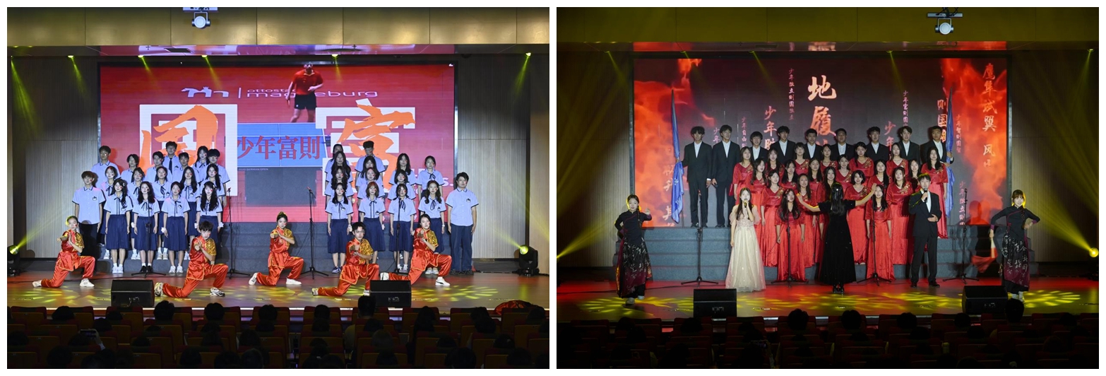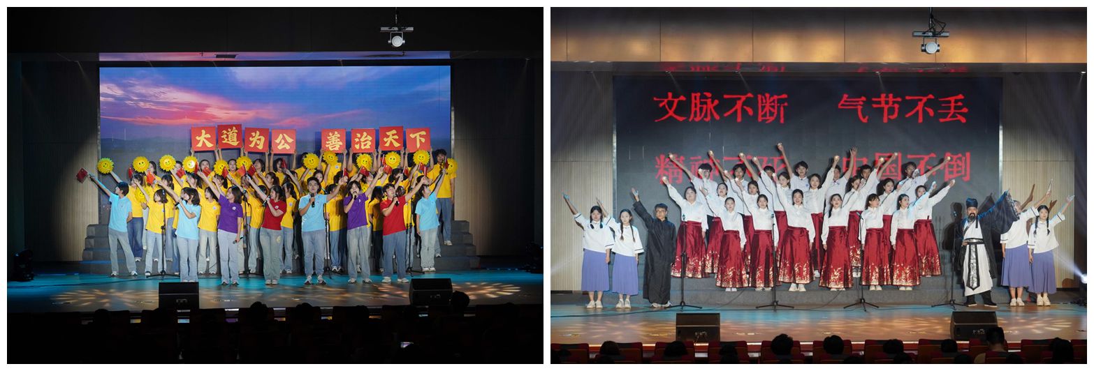 五四歌咏汇是思政育人与美育浸润的深度融合,依托“学校+场馆”育人资源,让舞台变成思政讲台,让文化厅变成思政课堂,共同奏响了一堂音乐与思政交融的青春“大思政课”。以合唱、朗诵、歌舞等形式为载体,在讴歌时代主旋律中坚定文化自信、厚植家国情怀,在校园集体文化活动中培育文化精神、凝聚奋进力量,引导学生沉浸式在情景中感知、在歌声中共鸣、在合作中成长,为学校“文化建设年”注入青春力量,为中国式现代化建设挺膺担当。