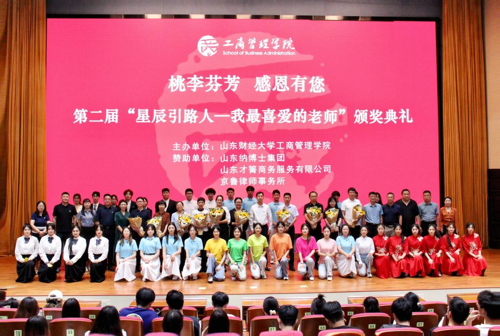 6月12日下午,工商管理学院第二届“星辰引路人—我最喜爱的老师”颁奖典礼在章丘校区图书馆报告厅举行。校党委副书记谢申祥、山东纳博士集团人力资源部经理倪福叶、京鲁律师事务所执行主任孙京祥出席活动。