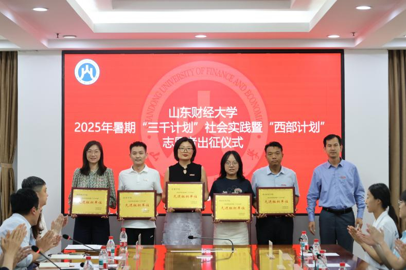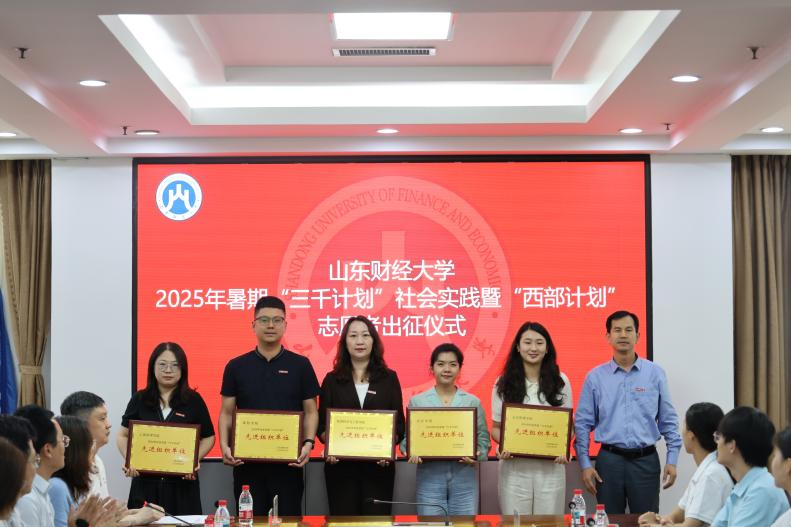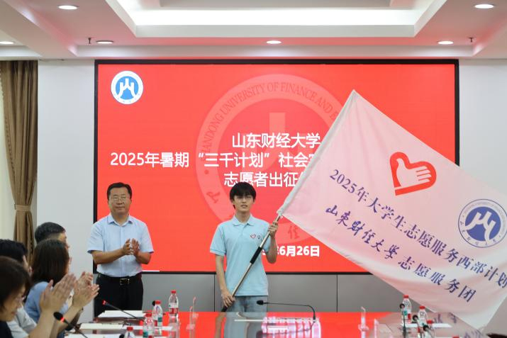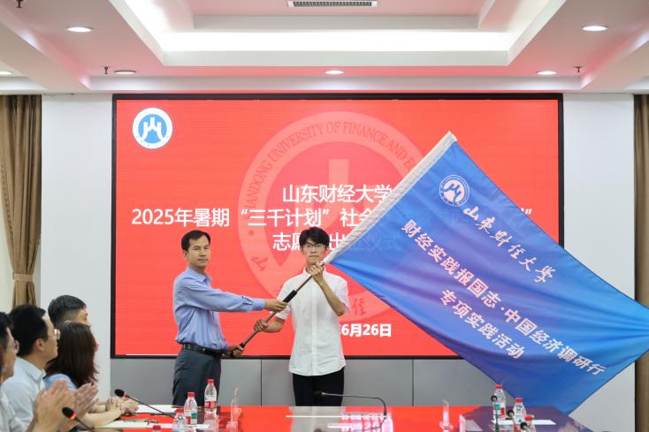 校领导向2025年“三千计划”校级重大立项团队、“财经实践报国志·中国经济调研行”专项实践活动团队、第27届研支团代表、“西部计划”志愿者代表依次授旗。