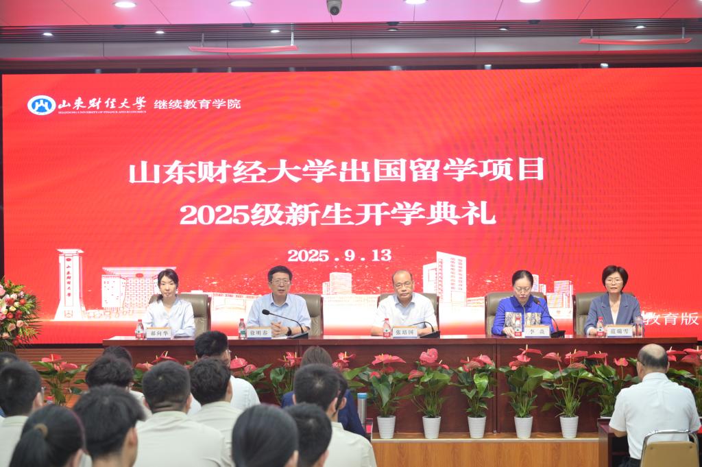 9月13日,山东财经大学出国留学项目2025级新生开学典礼在舜耕校区举行。校党委副书记张培国出席典礼并致辞。典礼由继续教育学院党委书记李焱主持。