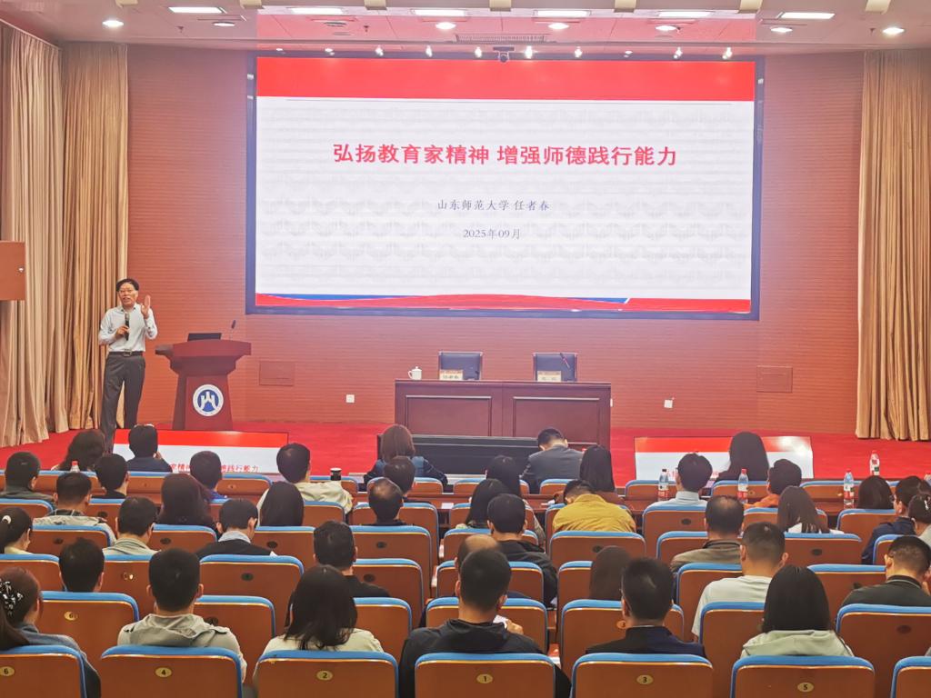 山东省首批师德宣讲团成员、山东师范大学任者春教授应邀作题为《弘扬教育家精神 增强师德践行能力》报告。他从厚植教育初心,升级思政引领力;坚守师德底线,强化准则规约力;深耕学科教学,提高教育专业力;建立心灵联结,增强育人共情力;涵养师者气象,彰显生命大化力等五个方面,阐释了新时代教师如何锤炼高尚师德、恪守师德底线、做有信仰、有情怀的“大先生”。报告内容详实、案例鲜活、语言生动,既有理论高度,又有实践指导意义,为全体教师落实立德树人根本任务、提升教书育人本领提供了启迪和路径;为新入职教师提高师德素养,坚守职业操守和行业规范,争做新时代好老师指明了方向。
