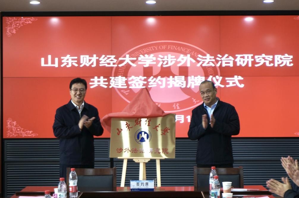 张培国、苏卫东为“山东财经大学涉外法治研究院”揭牌。