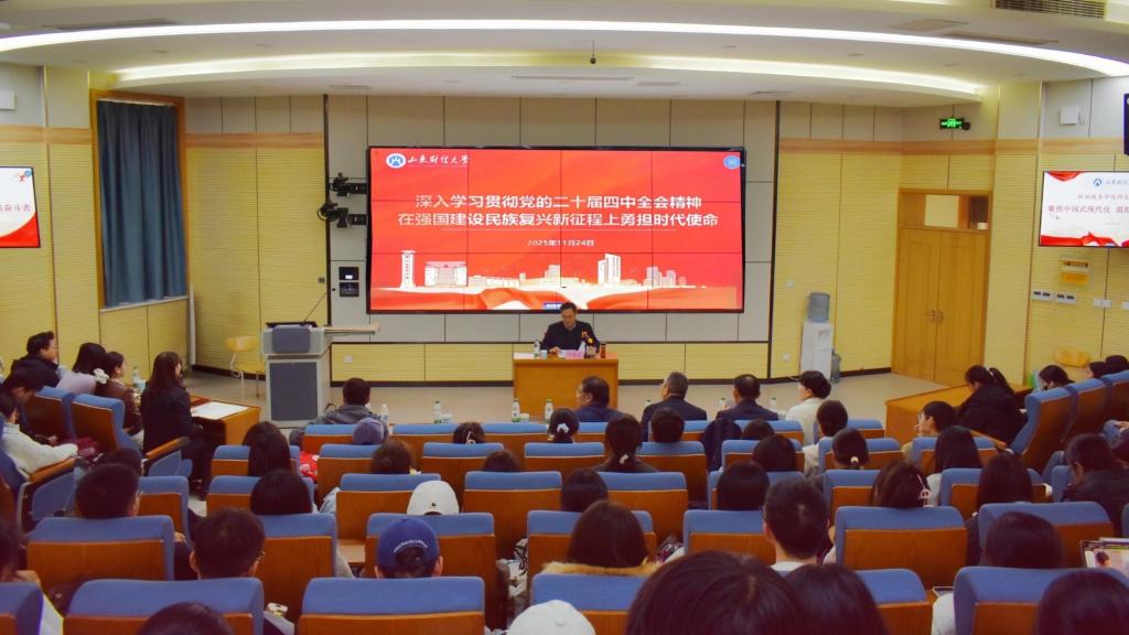 11月24日下午,财政税务学院召开学习贯彻党的二十届四中全会精神宣讲报告会。学校宣讲团成员、副校长王敬政以《深入学习贯彻党的二十届四中全会精神 在强国建设民族复兴新征程上勇担时代使命》为题做宣讲报告。学院党委书记石伟主持,班子成员、师生代表等二百余人参加。