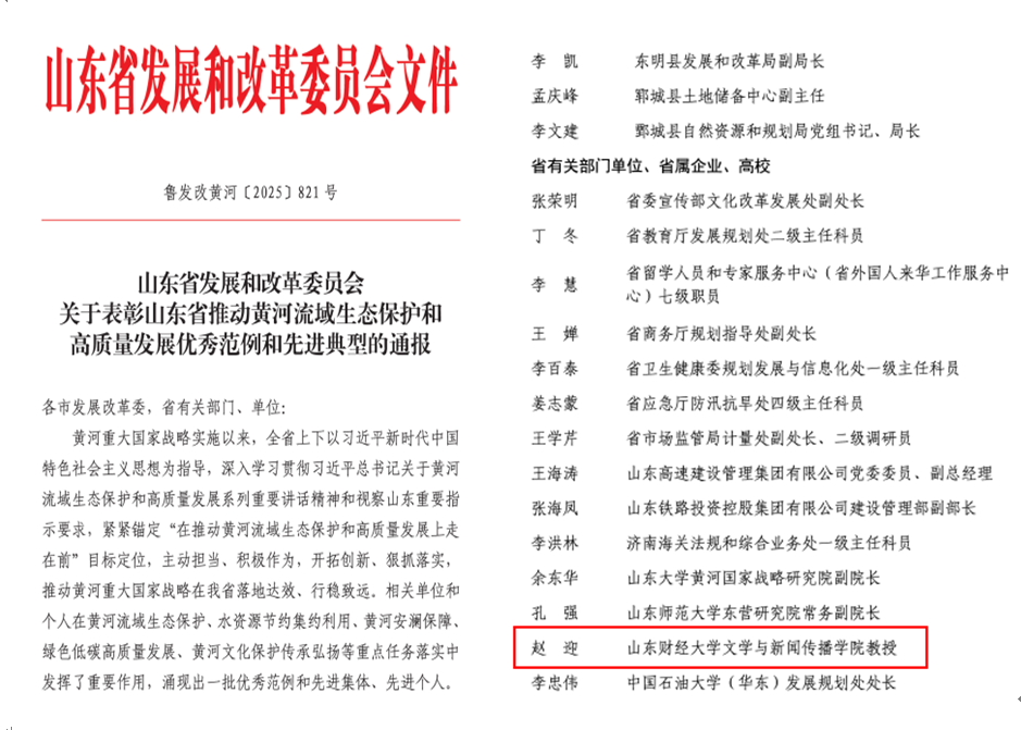 近日,山东省推动黄河流域生态保护和高质量发展优秀范例和先进典型评选结果揭晓,我校文学与新闻传播学院赵迎教授获评“先进典型”荣誉称号。