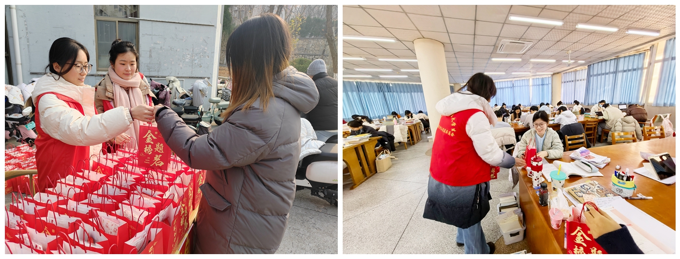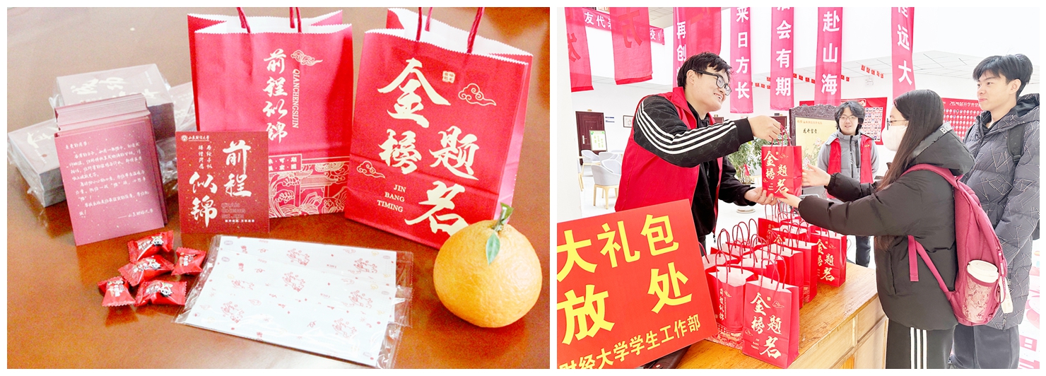 “能为学长学姐的考研路添一份力,特别有意义!”参与活动的志愿者难掩热忱,“希望这份礼包,能成为他们备考路上的动力,照亮前行之路。”而这份温暖也迅速在考研学子中传递,社交媒体上满是真挚感言:“走廊背书回来,书桌旁多了份红彤彤的礼包,瞬间被戳到。”“最近压力较大,这份意外的关怀让我开心了许久,爱在山财!”“寒冬里收到学校的暖心礼包,心里特别感动。这份关怀让我们感受到了牵挂与鼓励,也让我们更有信心坚持下去。”……朴实的话语里,满是被关怀的动容与冲刺的决心。