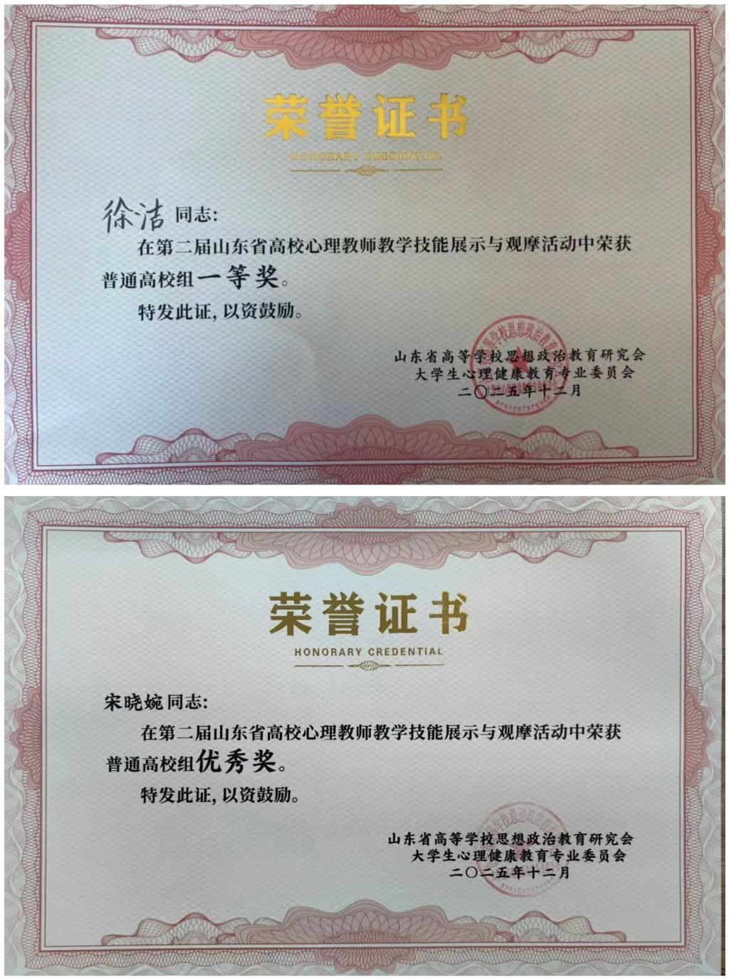 近日,由山东省高等学校思想政治教育研究会大学生心理健康教育专业委员会主办的第二届山东省高校心理教师教学技能展示与观摩活动在山东理工大学圆满落幕。经过激烈角逐,我校金融学院徐洁凭借课程设计《“偷感”探案录:破解你的隐形压力》荣获普通高校组一等奖;学生工作部宋晓婉凭借课程设计《学习与心理学——学习不靠蛮力靠心法》荣获优秀奖。