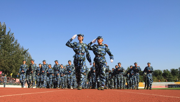 伴随着庄严肃穆的国歌,五星红旗冉冉升起。十响礼炮齐鸣,拉开了军训表演的帷幕。