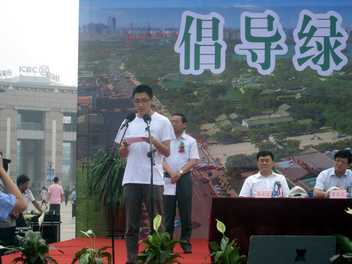 统计学院学生会主席王大鑫作为山东省青年环境友好使者团队的代表宣读了“2012年‘6.5’活动大学生环保倡议书”,向全省100多万在校大学生发出环保倡议,倡议大学生要充分发挥青年环境友好使者的带动示范作用,挖掘整合当地环保宣教资源,加强与环保部门、机构、企事业单位、公众媒体以及其他有志于环境保护的组织和个人的交流与合作,积极开展一系列的环保公益宣传活动。作为大学生,在平时生活中要注意崇尚节俭,适度消费,养成良好的绿色消费习惯。树立生态文明观念,自觉关心环境状况,做生态文明的传播者。随后省、市领导共同为山东青年环境友好使者团队授旗,并现场观看了我省全民生态环境教育成果展。