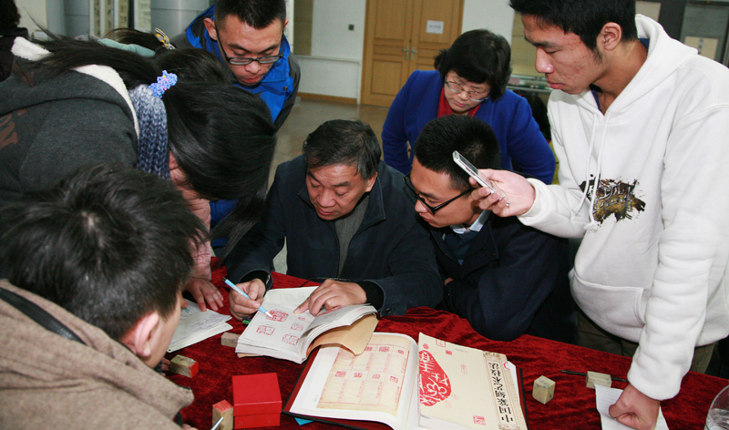 中国印学博物馆副馆长吴莹和西泠印社的同事现场指导东方学院选修《篆刻》课程的学生刻印。篆刻以“中国梦”和“泰山情”为主题,专家们从选印、摹写、构图、基本刀法等技术问题入手,为同学们一一指点,并将自己的心得体会与他们分享。