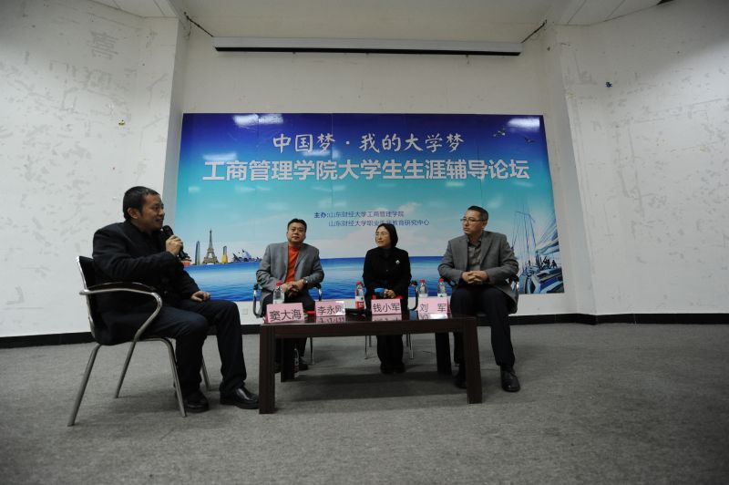 12月20日晚,工商管理学院在明水校区学术报告厅举办了2013级新生生涯辅导大型论坛活动——“中国梦,我的大学梦”。清华大学经管学院钱小军教授、济南市建筑安装总公司董事长兼党委书记李永刚博士、山东财经大学工商管理学院院长刘军教授应邀与在场的800余名大学新生进行现场交流和互动。论坛由团中央青年创业国际计划山东导师委员会副主席、中央电视台“赢在中国”创业比赛全国亚军(2007)、工商管理学院教师窦大海博士主持。