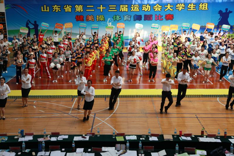 6月27-30日,山东省第二十三届运动会健美操和体育舞蹈比赛(大学生组)在我校舜耕校区体育馆举行。来自全省39所高校的790名运动员参加了比赛。比赛分设甲、乙、丙三个组别进行,其中,甲组为本科院校普通学生组,乙组为高等职业院校、专科院校和独立学院学生组,丙组为本科院校高水平运动员组。