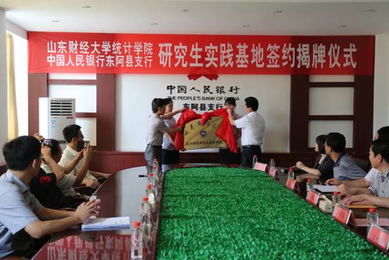 8月14日上午,统计学院与中国人民银行东阿县支行联合共建研究生实践基地签约揭牌仪式在东阿县人民银行举行。统计学院院长石玉峰、党委书记姜伟一行参加了签约挂牌仪式。参加仪式的还有中国人民银行聊城市中心支行副行长王武声、中共东阿县委书记刘国强、中共东阿县人民政府副县长江绍华、中国人民银行东阿县支行行长李宝宽出席了揭牌仪式。仪式由王武声主持。
