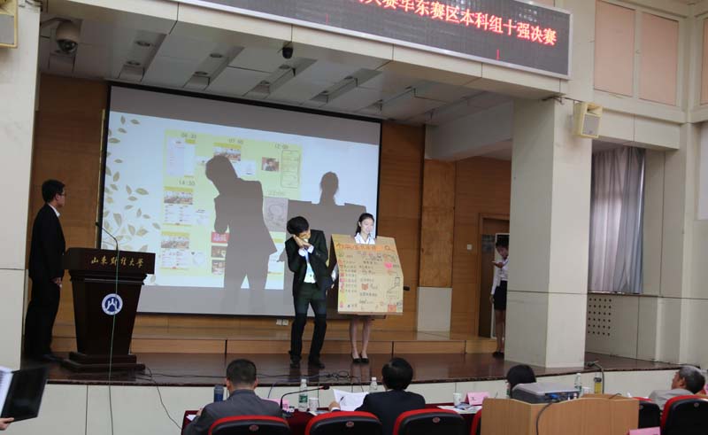 10月22日下午,由校团委和管理科学与工程学院共同承办的邮储银行杯中国互联网协会第八届全国大学生网络商务创新应用大赛(简称“网商赛”)华东赛区十强赛在我校燕山校区3号报告厅成功举办。大赛组委会主任中国信息经济学会实践教学研究与创新专业委员会常务副秘书长刘芳、山东省电子商务协会秘书长李俭、邮储银行总行电子银行部副处长宋研、山东省分行电子银行部主管李丹静、济南分行副行长和雯、校团委书记刘奇耀出席比赛。来自鲁、苏、皖、浙4省9所高校的10支团队参加了比赛,我校管理科学与工程学院师生140余人观摩了大赛。