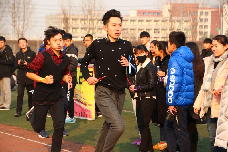 同日下午,四个校区的万米接力长跑隆重开场。各学院代表队由五名男生和五名女生组成,男生绕操场跑3圈,共1200米,女生绕操场跑两圈,共800米。接力以宣传“一二•九”爱国主义旗帜为传递物,象征中华民族新一代青年在“一二•九”爱国主义精神的引领下奋勇争先,勇往直前。比赛的队员们不畏严寒,手持飞扬旗帜,步幅矫健有力,火热的心引领他们冲向终点。经过两个小时激烈角逐,工商管理学院、金融学院、艺术学院和体育学院分别夺得明水、圣井、燕山和舜耕校区的第一名。