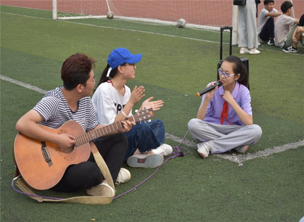 第三环节是到操场进行团建活动。志愿者们通过“桃花朵朵开”“你喜欢我吗”等游戏活动让队员们感受到快乐的同时,增进队员间的友谊与默契。游戏环节结束后,音韵集乐社、审艺堂街舞社、国防教育协会为队员们带来音乐、舞蹈、军体拳的精彩表演。