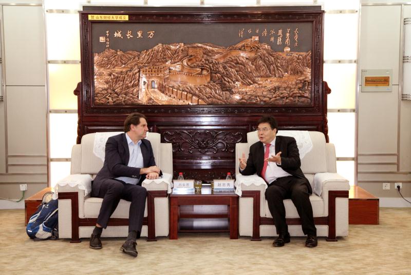 3月1日上午,山东财经大学校长赵忠秀会见了吕安迪(Andreas Loeschel),教务处处长陶虎、国际交流与合作处处长王剑波、外国语学院院长李毅等陪同参加。赵忠秀对吕安迪一行来访表示热烈欢迎,并介绍了山东财经大学校情、未来发展方向及山东省能源产业升级等情况。吕安迪重点介绍了德国能源转型与新经济发展的关系。赵忠秀表示,新兴产业的发展为高校社会急需专业建设带来新的发展机遇,未来山财大将进一步加强产教融合,提高服务山东经济社会发展能力,并探讨了联合建立山东财经大学低碳经济研究院的可行性与必要性。双方还就促进学生交流、深化国际交流、推动山东省与德国的交流合作等方面达成共识。