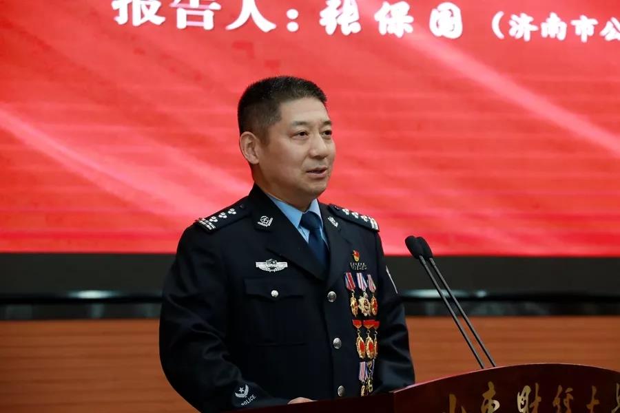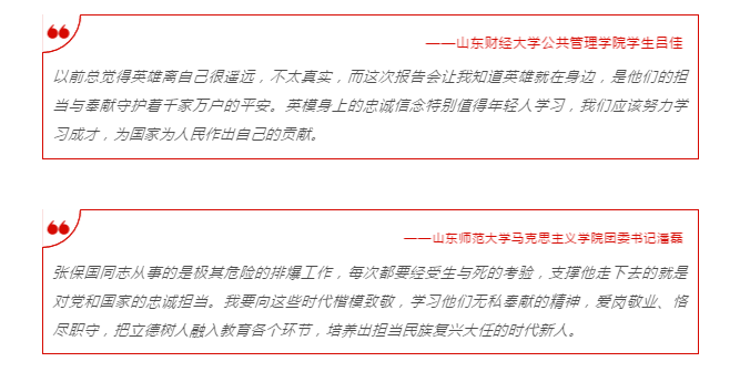 报告会上,济南市公安局特警支队支队长刘宜武、济南市公安局特警支队作训处排爆中队民警陈龙、张保国的妻子李静、山东广播电视台记者李平等报告团成员,先后从同事、“徒弟”、妻子、记者的不同视角,用朴实的语言、真挚的感情和生动的细节,向广大师生再现了张保国战斗在排爆一线的英雄事迹,展示了张保国英勇无畏、不惧万难的英雄本色和敬业奉献、敢于担当的家国情怀。