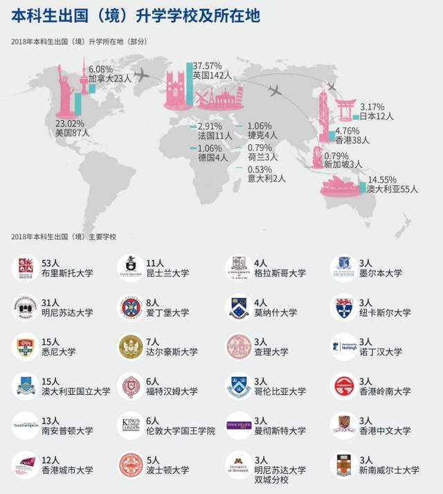 2018届本科生毕业生出国(境)升学所在地以英国、美国、澳大利亚、加拿大、香港等地为主,其中,英国占比37.57%,位居第一。从学校上来看,包括了布里斯托大学、昆士兰大学、明尼苏达大学、爱丁堡大学、悉尼大学等世界名校。