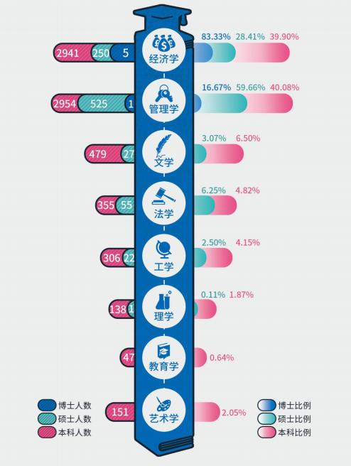 2018年,学校共有本科毕业生7371人,分布在全国30个省份,其中,山东省生源占比最大,达73.67%。这些本科毕业生分布于经济学、管理学、文学、法学、工学、理学、教育学、艺术学等八个学科,其中,管理学学科人数最多,占比达40.08%,共计2954人;经济学学科次之,共计2941人,占比39.9%。