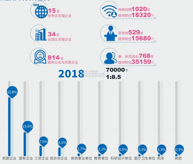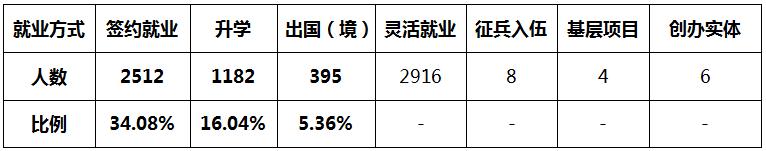 学校2018届毕业生就业方式呈现多元化趋势,主要为签约就业(三方协议书、劳动合同)、国内升学、出国(境)留学、征兵入伍、自主创业、基层项目就业、灵活就业等。