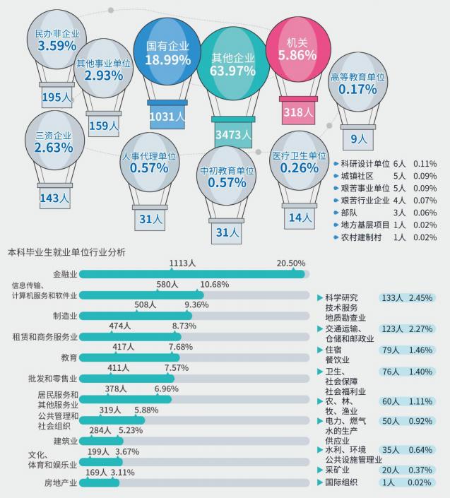 本科毕业生就业以企业为主,其他企业占63.91%,国有企业占18.99%。就业单位行业以金融业为主,达20.50%;信息传播、计算机服务和软件业次之,达10.68%。