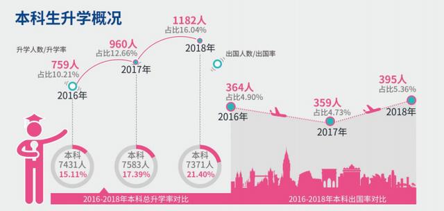 学校2018届本科毕业生中,升学1182人,出国395人,总升学率为21.40%,近三年总升学率总体上升。