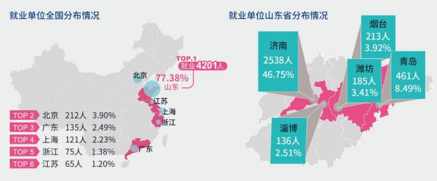 在2018届本科毕业生中,省外就业多集中于北京、广东、上海等省市,省内多集中于济南、青岛、烟台等城市。