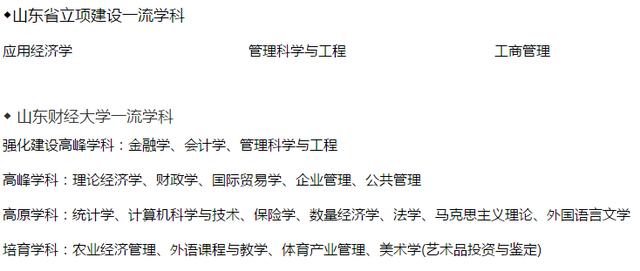 山东财经大学学科实力强劲,拥有应用经济学、工商管理、管理科学与工程、统计学4个一级学科博士学位授权点;10个一级学科硕士学位授权点;拥有工商管理硕士(MBA)、公共管理硕士(MPA)等14种硕士专业学位类别;分布在经、管、法、理、工、文、教育7个学科门类;拥有应用经济学等3个山东省立项建设一流学科,建设金融学等19个校级一流学科,形成了以经济、管理学科为核心,文、法、理、工、教育、艺术等相互支撑、协调发展的学科体系。