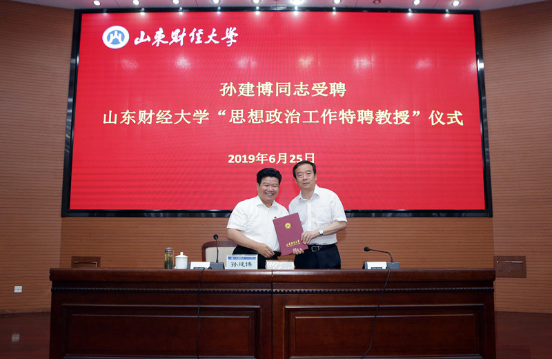 山东教育新闻网讯 6月25日下午,全国优秀党务工作者、“齐鲁时代楷模”、淄博市原山林场党委书记孙建博同志先进事迹报告会在山东财经大学燕山校区举行。山东财经大学党委书记王邵军在会上向孙建博颁发了聘任证书,聘任他为“山东财经大学思想政治工作特聘教授”;孙建博向山东财经大学赠送了自传体纪实文学三卷本著作《命运三部曲》。