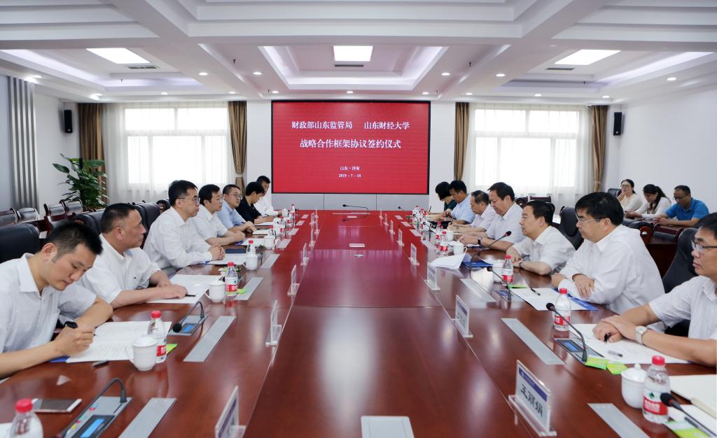 财政部山东监管局党组书记、局长王振东,山东财经大学校长赵忠秀代表双方签署协议。