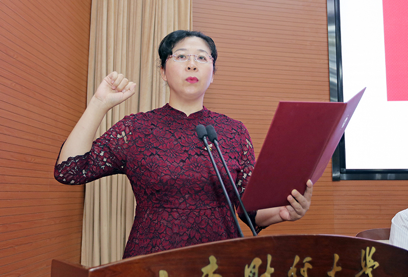 颁奖结束后,在全国优秀教师、国际经贸学院方慧教授领誓下,新入职的30名教师代表全体起立,面向国旗,举起右手,庄严宣誓,志愿成为光荣的山东财经大学教师,忠诚党的教育事业,遵守教育法律法规,为教育发展和民族振兴努力奋斗。