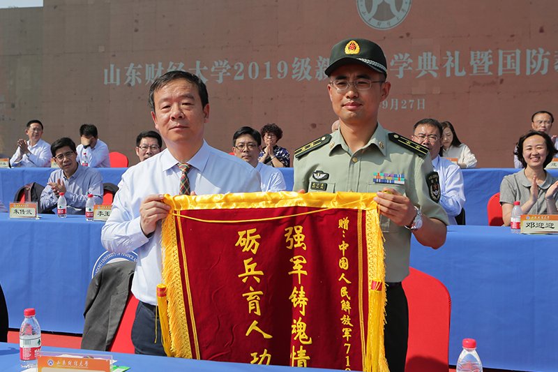 受嘉奖代表上台领奖后,赵小兵中校讲话。他希望同学们胸怀祖国,做奋斗者,立志成才,回报母校,希望山东财经大学的未来更美好。在全场的热烈掌声中,王邵军向赵小兵赠送了锦旗。