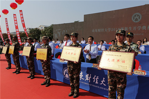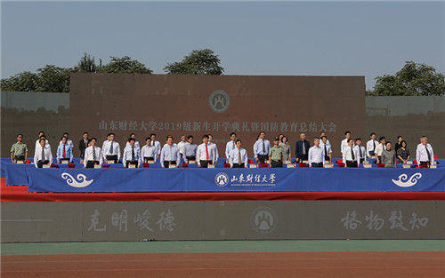 中国教育在线讯 盛世迎国庆,祝福连连;青春伴财大,豪情无限。9月27日,山东财经大学2019级新生开学典礼暨国防教育总结大会在圣井校区田径场隆重举行。校党委书记王邵军,校长赵忠秀,党委副书记车滨、赵友春,副校长綦好东、韩作生、陈晓兰、张书学、张新,中国人民解放军71939部队副参谋长赵小兵,校友代表、2001级市场营销专业校友、上海领路人集团董事长朱上民,教师代表、“泰山学者青年专家”、财政税务学院院长谢申祥等出席典礼。典礼由韩作生主持。