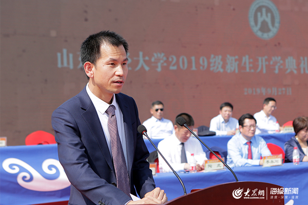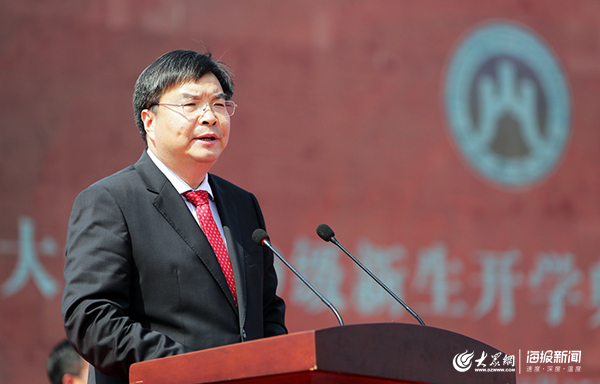 在热烈的掌声中,校长赵忠秀发表了题为《把自己交给梦想》的精彩致辞,他首先对6964名新生加入山财大表示热烈的欢迎,向关心财大、支持财大的家长、校友和社会各界人士表示衷心的感谢,并向辛勤参训执教的部队领导和教官表示诚挚的感谢。