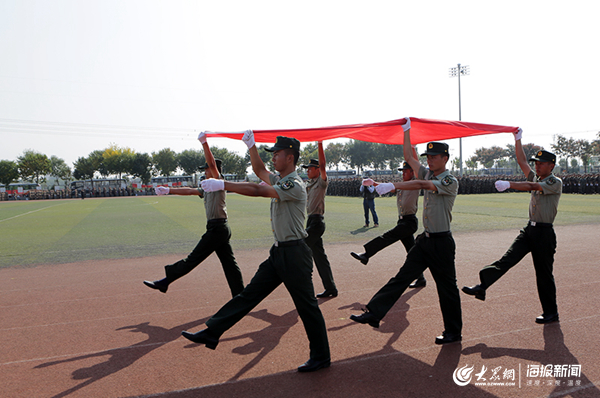 上午9时30分,典礼开始。校党委书记王邵军宣布“山东财经大学2019级新生开学典礼暨国防教育总结大会开始!”全体起立,迎国旗、唱国歌、升国旗。