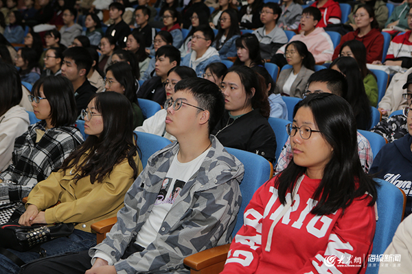 报告会上,郭永怀事迹报告团宣讲员、胶东(威海)党性教育基地郭永怀事迹陈列馆宣教部副主任王莹从荣成之子、潜心求学,两弹一星、功勋卓越,家国情怀、大师风范,以身许国、壮烈牺牲,怀瑾佩瑜、爱在天际五个篇章,向大家还原了郭永怀同志求学为国、学成报国、以身殉国的人生历程和光辉事迹, 展现了他对党忠诚、无私奉献的优秀品质,诠释了他对祖国的真挚情感和对科学事业的不懈追求。一段段深切感人的故事,一张张生动真实的画面,深深感染着现场每一位师生。当看到郭永怀在美国将研究手稿付之一炬,放弃优越的生活条件,突破重重阻挠义无反顾回到祖国怀抱时;当听到飞机失事后郭永怀与警卫员紧紧抱住的装有重要资料的公文包完好无损而遗体烧焦时……会场肃然起敬,感人肺腑的事迹,撞击着在场每个人的心灵,很多师生都默默擦拭着无法抑制的泪水。