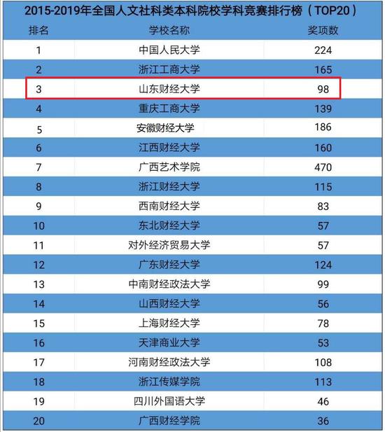2020年2月22日,中国高等教育学会《高校竞赛评估与管理体系研究》专家工作组发布2015-2019年和2019年全国普通高校学科竞赛排行结果,山东财经大学以获奖98项、总分65.57的成绩在本科组Top300榜单上位列第134位;位列全国人文社科类本科院校第三位;位列全国财经类高校第二位。