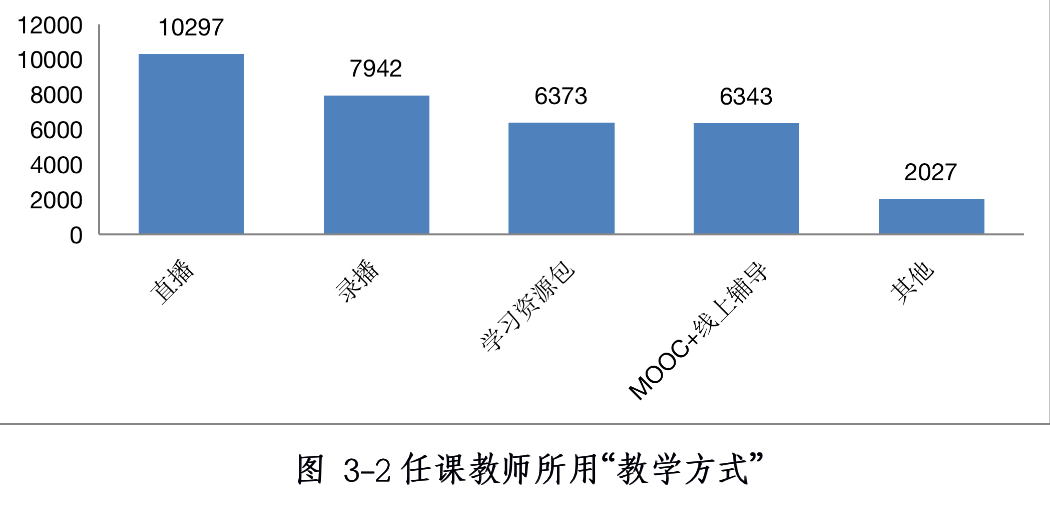 大部分学生认为,任课教师在线授课教学方式灵活多样,为学生线上直播学习及线下拓展学习提供宽阔便捷空间。在接受过各类教学方式的学生中,参与直播的占86.7%,录播占66.9%,学习资源包占53.7%,MOOC 线上辅导占53.4%,其他占17.1%。