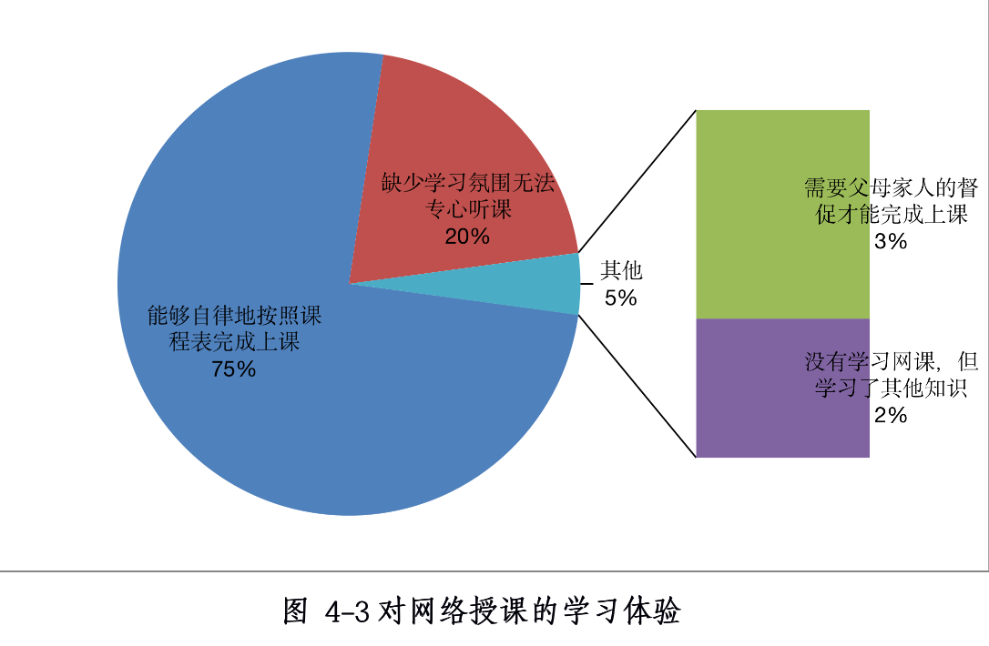 网课是对学生学习能力的一种检验,数据显示,75%的学生能够自律地按照课程表完成上课;感觉缺少学习氛围无法专心听课占20.48%;需要父母家人的督促才能完成上课占2.57%;没有学习网课,但学习了其他知识占1.71%。