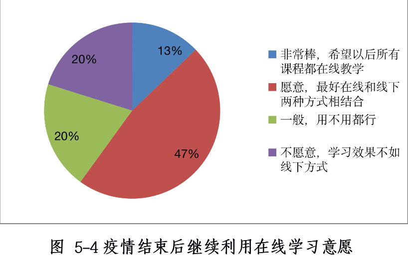 通过疫情期间的线上学习,也开启了一种新的学习模式,线上线下相结合的学习方式较受学生欢迎,选择“在线和线下两种方式相结合”的占到47.15%。“一般,用不用都行”和“不愿意,学习效果不如线下方式”的各占20%,选择“希望今后所有课程都采用在线教学”的占13%。