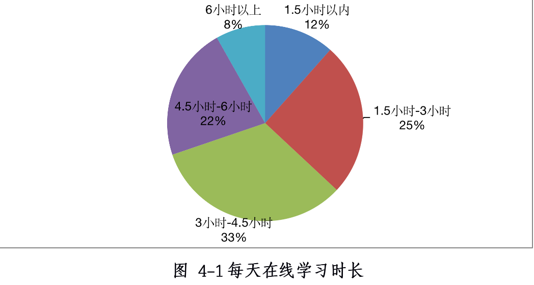 从学生在线学习的时长来看,学习1.5小时以内的占11.56%,1.5小时-3小时的占25.39%,3小时-4.5小时的占32.82%,4.5小时-6小时占22.03%,6小时以上占8.19%。