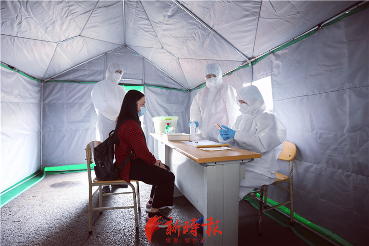6日下午3点,山财大第二次防疫演练在舜耕校区开启,演练区域主要是校门口、教学楼、学生宿舍和食堂。在该校区大门内道路南侧设置的人行通道上,搭建有一个防疫帐篷,内置一个测温摄像头,行人间隔两米进入帐篷后,摄像头便可实时测温,体温异常还会发出警报。该校保卫处工作人员介绍,如果学生入校过程中发现体温异常者,通过复测仍异常时,则人行通道就将及时关闭,开启道路北侧的备用通道,并有专人对体温异常学生经过的地方消毒。