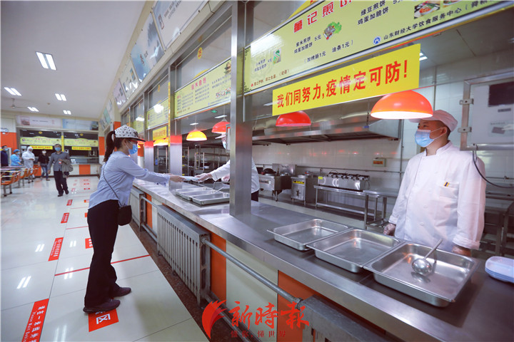 在食堂,山财大也设置了严格的就餐流程,将延长就餐时间,错时就餐,体温异常者避免进入食堂,排队候餐保持1米以上间距,就餐时1人1桌同向就餐,鼓励自带餐具和打包带走用餐等。记者在该校区食堂看到,每个原有4个座位的餐桌,有3个座位被胶带或警戒线缠绕,就餐者只能在指定座位上就餐。