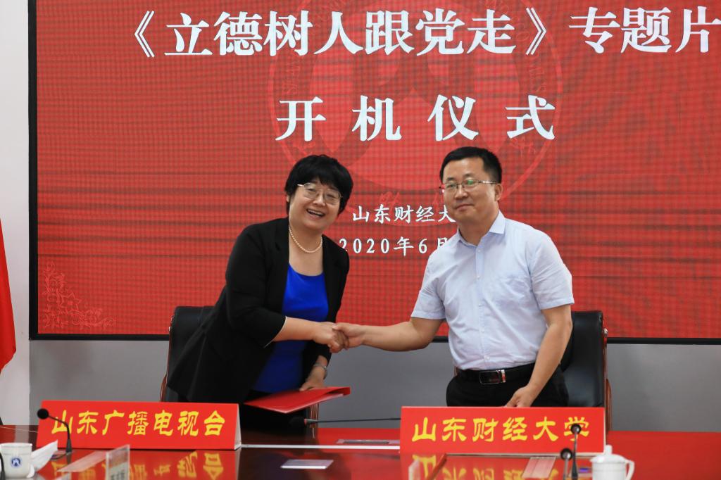 王邵军在欢迎辞中表示,近年来,学校认真贯彻习近平总书记关于弘扬优秀中华传统文化和传承红色基因的重要论述,紧紧围绕“培养什么人、怎样培养人、为谁培养人”这一根本问题,突出“三全育人”的创新设计,聚焦红色引领,深入挖掘齐鲁红色历史文化资源,丰富完善传承传统文化的思想教育体系,探索构建传承红色基因的实践养成体系,着力打造齐鲁传统文化、红色文化传承的“财大样板”。拍摄《立德树人跟党走》专题片,将集中呈现山东财经大学思想政治教育的创新实践,把财大故事搬上银屏,彰显“为国育才、为党育人”的初心使命,让思想政治教育“立起来”“活起来”“亮起来”。希望山东广播电视台与山东财经大学发挥各自优势,精诚合作,把专题片拍摄成为记录成长、催人奋进、感人至深的一部精品力作,让红色文化和齐鲁文化传播得更远、更广,以实际行动向中国共产党成立100周年献礼。